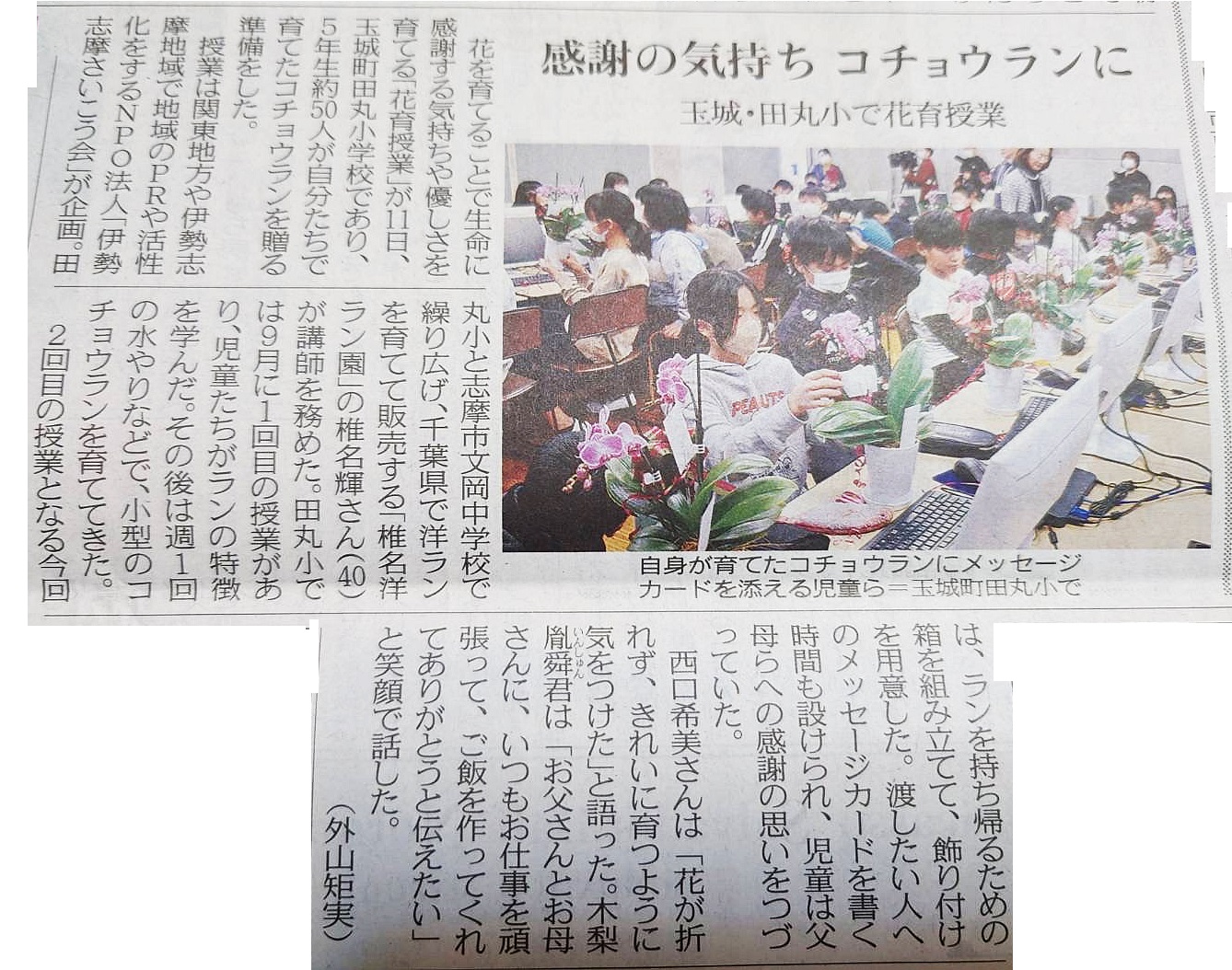 2023年9月28日、29日(前半の部)と2024年12月11日、12日(後半の部)に、玉城町立田丸小学校5年生と志摩市立文岡中学校(1年から3年生の選抜)で花育授業を実施しました。田丸小学校での後半の部の様子がNHK(津放送局)12月11日18:30からの「まるっとみえ」で放送され、下記ウェブサイトで公開されています。